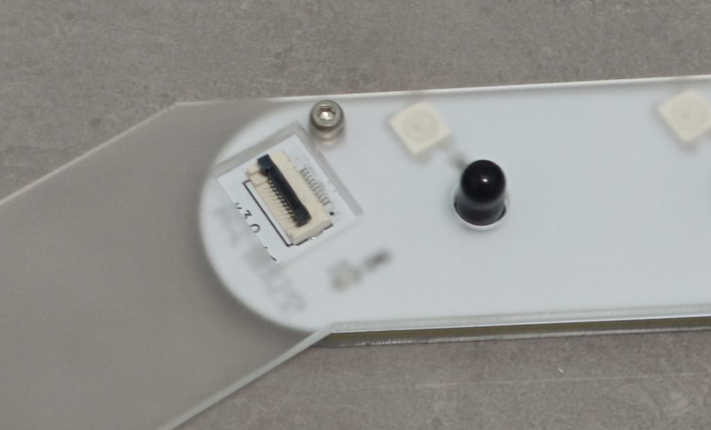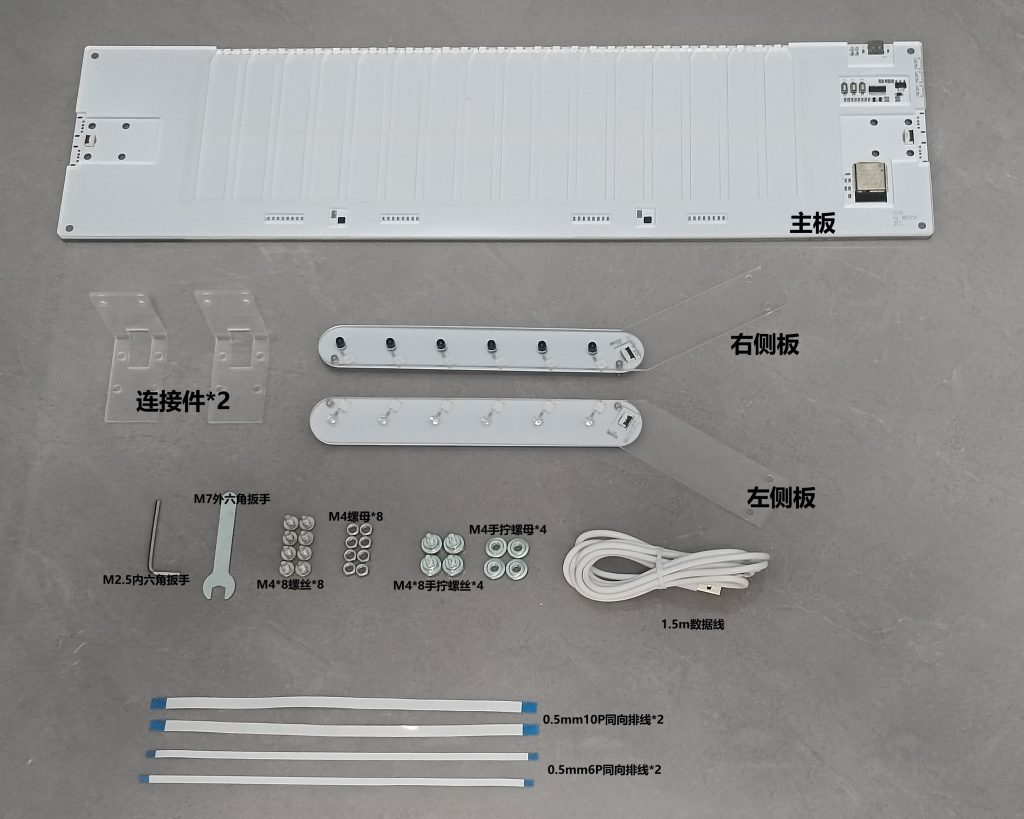 透明灯珠的为左侧板,黑色灯珠的为右侧板,左侧板对应的是细排线,右侧板对应的是粗排线。