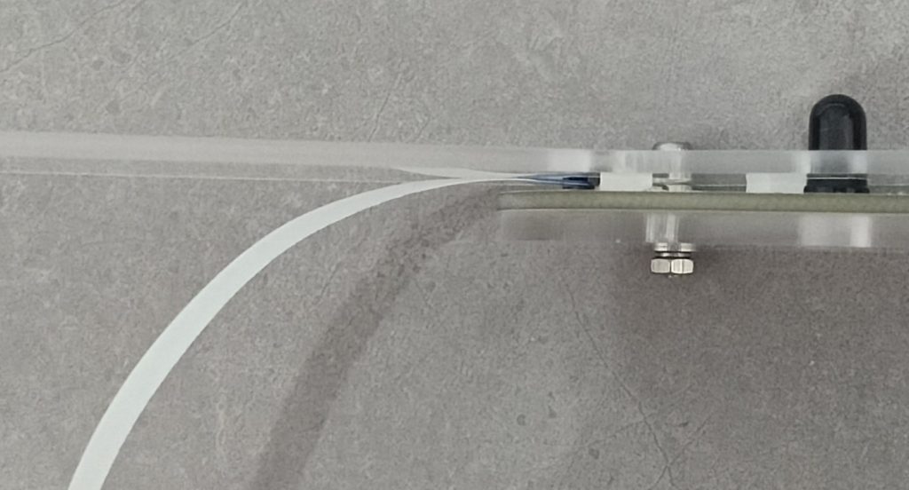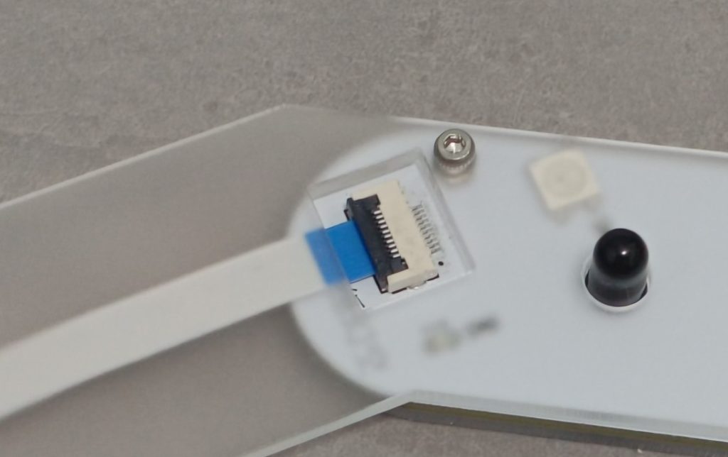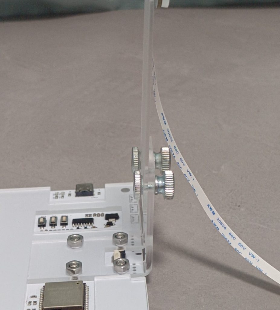 将粗排线的蓝色面朝上,从亚克力下方插入排线连接器中,注意要插到底,然后盖下盖子。