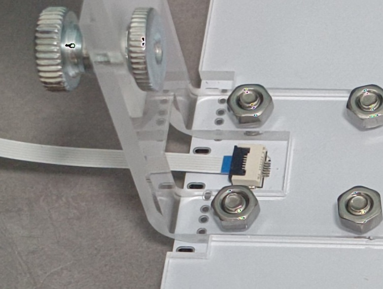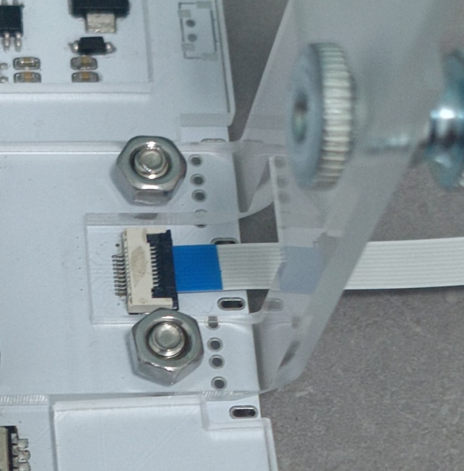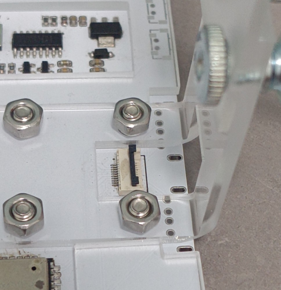 将右侧板排线的蓝色面朝上,从亚克力下方插入排线连接器中,注意要插到底,然后盖下盖子。